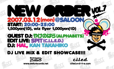 "NEW ORDER vol.7" 2007/03/12(Mon) @代官山SALOON START: 20:00?25:00 1,500yen(1D) / wiz FLYER 1,000yen(1D) GUEST DJ: やけのはら(ALPHABETS) EDIT LIVE: SPIT(C.I.L.E.D.) DJ: HAL, KAN TAKAHIKO &more TBA... http://www.delicrecords.net/ http://ciled.e-d-i-t-s.com/ DJ LIVE MIX & EDIT SHOWCASE!
