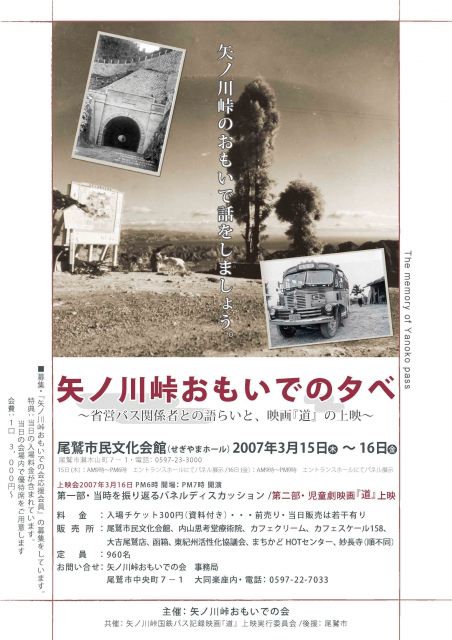 ■表題 矢ノ川峠おもいでの夕べ〜省営バス関係者との語らいと、映画『道』の上映〜 ■開催日 2007年3月15日(木)〜16日(金) ■日程 ◆内容 15日(木) 9時〜18時 エントランスホールにてパネル展示 16日(金) 9時〜21時 エントランスホールにてパネル展示 16日(金) 18時〜21時 省営バス関係者との語らいと、映画『道』の上映 ※スケジュール 18時 開場 19時 開演 第一部 当時を振り返るパネルディスカッション 第二部 児童劇映画『道』上映