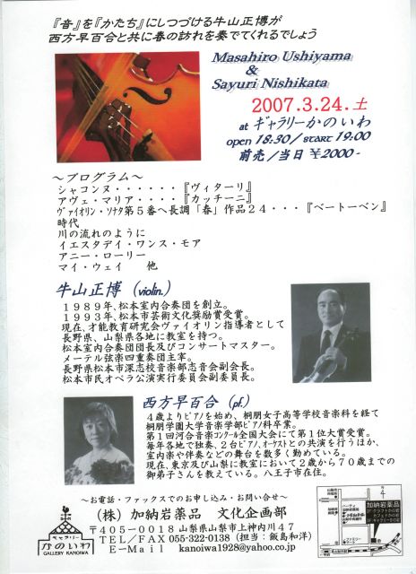 『音』を『かたち』にしつづける 牛山正博と西方早百合。 この2人を迎えてお送り致します。 〜プログラム〜 シャコンヌ・・・・・・『ヴィターリ』 アヴェ・マリア・・・『カッチーニ』 ヴァイオリン・ソナタ第5番へ長調「春」作品24 ・・・・・『ベートーベン』 時代 川の流れのように イエスタデイ・ワンス・モア アニー・ローリー マイ・ウェイ 他 様々な曲を織り交ぜた演奏内容を予定しています。 ヴァイ