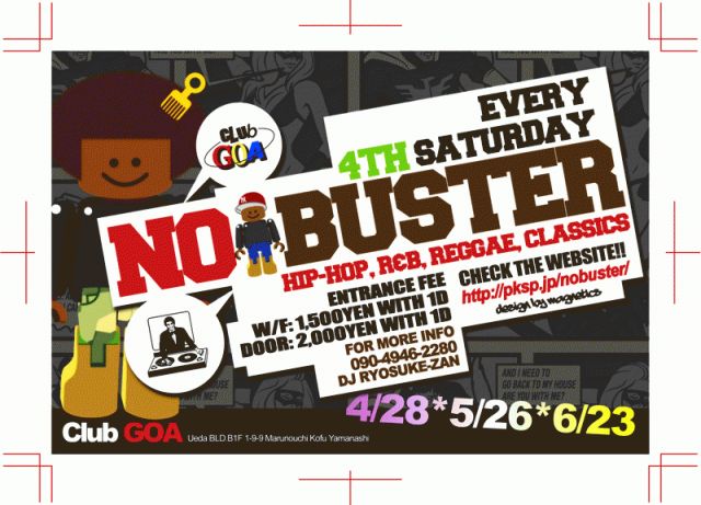 3/24(SAT) @GOAにてNO BUSTERやります。 毎月第四土曜日やってます。 みんなで週末楽しみましょう♪ よろしくっす ちなみに↓↓↓ 9:00-9:40 BABY-T 9:40-10:20 RSKZ 10:20-11:00 NAOYA 11:00-11:40 KEN-G 11:40-12:20 BABY-T 12:20-12:50 SHOWCASE 12:50-1:30 RSKZ 1:30-2:10 NAOYA 2:10-3:00 KEN-G