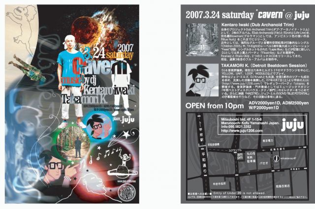 3.24(sat) cavern@juju house,garage,and all dance music!!!!! special guest Kentaro Iwaki(Dub Archanoid Trim) TAKAMORI K.(Detroit Beatdown Session) 22:00 start ticket,with flyer 2000yen(1drink) door 2500yen(1drink) info 090-5821-3352(juju) juju http://www.juju1208.com/ support by cavern,juju Kentaro Iwaki(Dub Archanoid Trim) 自身のプロジェクトDub Archanoid Trim(ダブ・アーカノイド・トリム)として、2枚のアルバム、『Dub Archanoid』(File)と『Grott』(Life