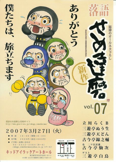 来年から開催が奇数月に変更になるそうです。 理由は・・・第6回での前説のとおり(ふふっ)。 新作!落語せめ達磨 第7回 2007年3月27日(火)開演19時 開場18時30分 会場 キッドアイラックアートホール 世田谷区松原2-43-11(明大前駅より徒歩2分) 木戸銭 当日 2,000円 予約 1,800円 出演 錦之輔・天どん・ぬう生・らくB ゲスト 三遊亭白鳥 祝二ツ目昇進 寿ゲスト 古今亭駒次 栄助さんの高座はありませんが、前説などされるかと。 ココの人たちは自分の高座がない回は 明るい表情を