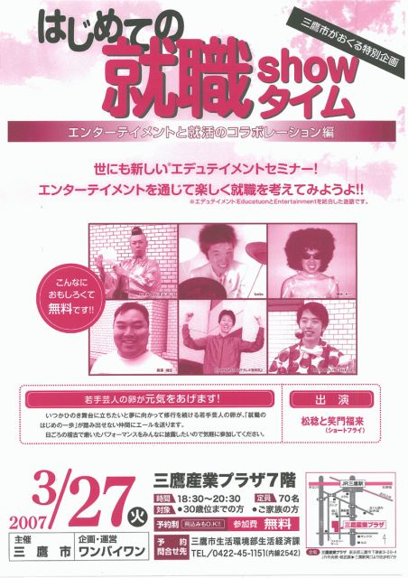 楽しみながら参加できるエデュケインメントセミナーを 企画しましたので紹介いたします。 イベント、セミナー内容 三鷹市と若年者の自立・就業支援をする(株)ワンバイワンは、2007年3月27日に、三鷹産業プラザにおいて、フリーターの就職活動を支援するために、楽しみながら参加できるエデュケインメントセミナー「はじめての就職showタイム」を開催することになりました。NPO日本キャリアビジョン研究所は当日の運営をいたします。 若手芸人の卵が元気をあげます! いつか桧舞台に立ちたいと夢に向かって修行を続ける若手芸人の卵が、