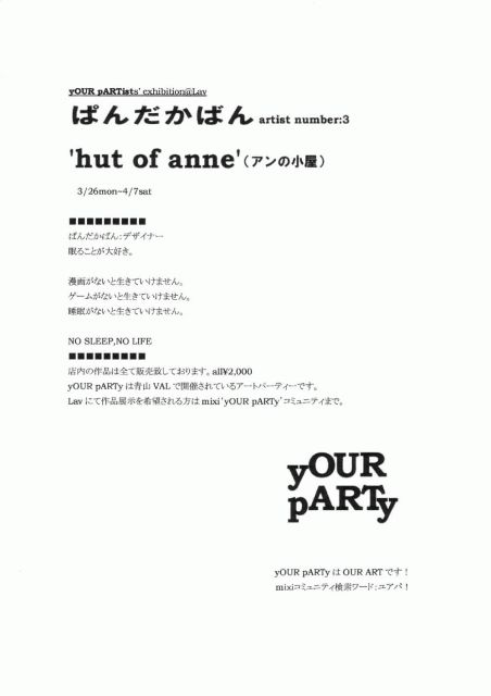 ぱんだかばん写真展@Lav 『hut of anne』(アンの小屋) ■■■■■■■■■ ぱんだかばんhttp://mixi.jp/show_friend.pl?id=139433 眠ることが大好き。 漫画がないと生きていけません。 ゲームがないと生きていけません。 睡眠がないと生きていけません。 NO SLEEP,NO LIFE ■■■■■■■■■ ぱんだかばんさんの愛犬アンの写真展です! ぱんだかばんさんの在廊日は直接お問い合わせくださいm(__)m ☆恵比寿Lav☆ [CAFE] 14:30-17:00 [LOUNGE BAR] 18:00-25:00 / L.O 24:00(food) [CLOSE]