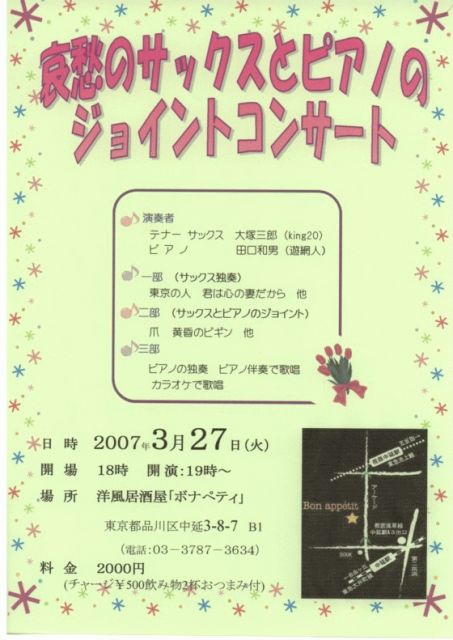 昭和20年代コミュのking20さんと 旧FS20の遊網人さんとのジョイント・コンサートが実現いたしました。 皆様 どうぞご参加ください。 以下のよう行いますので 御出席いただける方は 早めにこちらに出席を表明 お願いいたします。 ☆☆☆☆☆☆☆☆☆☆☆☆☆☆☆☆☆☆☆☆☆☆☆☆☆ 一部 哀愁のテナーサックス saxophoneソロ演奏 king20 二部 ピアノとサックス ピアノ 遊網人 ジョイント・コンサート saxophone king20 三部 ピアノ演奏と カラオケ 日時:2007年3月27日(火)