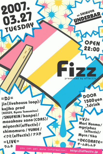 2007.03.27 TUE Fizz [presented by effectiv] @渋谷UNDER BAR (http://www.underbar.jp/) OPEN - 22:00 DOOR - 1500yen_1drink GENRE - house http://effectiv.jp =GUEST DJ= JIN (livehouse loop) =DJ= kojika prod [KOSSY, Ryota Tomomitsu] kanpei masakazu sano (CDAS) miyacchi (effectiv) shimamura SNUFKIN YUMIE イクミ (effectiv) ナス子 =LIVE= ラムネ =VJ= Mari Honma mgniphex (effectiv) Myco ちka -DECOLATE- チームおしん子 ***** とーっても