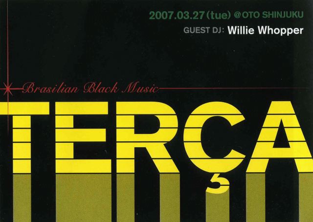 テルサのお知らせです。 堀内隆志、大島忠智、伏黒新二が主催するイベント「テルサ」。 テルサってポルトガル語で火曜日のこと。 火曜の夜だからできる、ちょっとヒト味違うブラジリアン・ミュージックをお届けします。 中村智昭さん〔MUSICAANOSSA〕もレギュラーDJとして参加。 ますます盛り上がっています。 3月は、ゲストDJとして、Willie Whopperさんをお迎えいたします。 世界が大注目のディスコ、ブギーに“ブラジル”というエッセンスが散りばめられたメロディーの数々をお楽しみに! さ