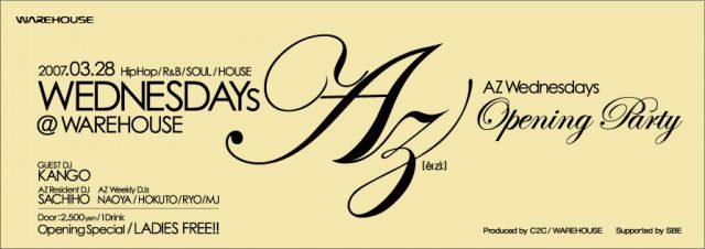 2007年3月、WAREHOUSEが新たに提案する毎週水曜日のパーティー“AZ Wednesdays”がスタート! WAREHOUSEが新たに提案するのは、 Hip-Hop・R&BにHouseも加えた、NYスタイルのパーティー。 昨年、六本木ヴェルファーレにて毎週金曜の人気パーティー“Sound Base”を手がけたC2Cがプロデュース、レジデントDJの<DJ SACHIHO>とセクシーな<Go-Go Dancers>が毎週水曜を盛り上げます! opening partyは 3月28日 !!! 22:00 OPEN 2500yen w/1Drink ☆ Opening Special: Ladies FREE!! ☆ 女性入場無料! AZ Resident DJ: