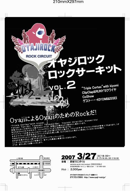 中高年バンドメンバー募集site"オヤジロック!BBS”(ttp://www.oyaji-rock.jp/)が「NHK 第10回 熱血!オヤジバトル」で紹介されました。 NHK出演を記念して、3月27日に原宿クロコダイルにてライブを開催します! お時間がある方は、ぜひお越しください。 日時 2007年3月27日 (火曜日) 会場 原宿 クロコダイル (CROCODILE) オープン 18:00 スタート 19:00 チケット 2,000円 出演バンド "Triple Cortex" with kiyomi ClipClap&RUNY'Sクワイヤ CoShow ゲスト…KIYOMI&ISSEI