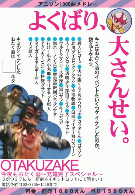 いきなりで申し訳ございませんが、本日、新宿のネイキッドロフト(http://www.loft-prj.co.jp/naked)で行われる、「アニソン1000曲メドレーwith今夜もおたく酒〜充電完了スペシャル〜」というイベントに、ハナヨ先生がゲストとして出現するそうです。 詳しくはこちら↓ http://otakusake.cocolog-nifty.com/blog/2007/03/post_f6c9.html 暇な人はぜひ行って見てください。 よろしうお願いいたします〜