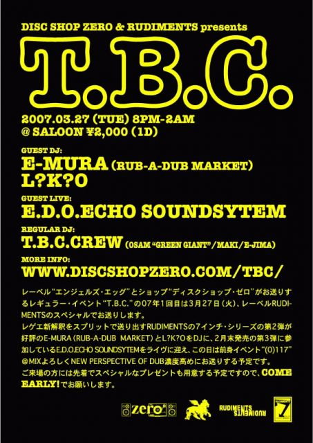 E.D.O.ECHO SOUNDSYSTEMのライヴのお知らせです! DISC SHOP ZERO & RUDIMENTS presents "T.B.C." 2007.03.27 (TUE) 20:00〜26:00 @SALOON, DAIKANYAMA \2,000 (w/1DRINK) GUEST LIVE: E.D.O.ECHO SOUND SYSTEM GUEST DJs: E-MURA (RUB-A-DUB MARKET) L?K?O REGULAR DJs: T.B.C. CREW (MAKI / E-JIMA / OSAM "GREEN GIANT") 第4回はRUDIMENTSレーベル・スペシャル! ■レーベル“エンジェルズ・エッグ”とショップ“ディスクショップ・ゼロ”がお送りするレギュラー・イベント“T.B.C.”、2007年1回目は3月27日(火)、ゼロの