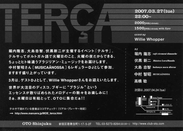 ども! 春めいてきましたね! 今月もテルサをよろしくお願いします! --------------------------------------------- <TERCA> 3月27日(火)※毎月第4火曜日 22:00~ 2000 yen(with 1drink) ※フライヤー持参の方はディスカウント500円引き!! @OTO:新宿区歌舞伎町1-17-5-2F / TEL:03-5273-8264(22:00~) DJ: 堀内隆志(cafe vivement dimanche) 大島忠智(balanca nova discos) 伏黒新二(Musica LocoMundo) 中村智昭(MUSICA NOSSA/Cafe Apres-midi) 高橋稔 GUEST DJ:GUEST DJ:Willie Whopper(Aparecida) http://mix