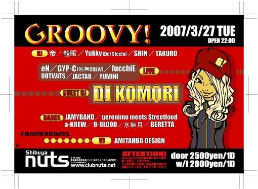 毎度大騒ぎのPARTY、『GROOVY!』が 今月もいよいよ今月27日、開催いたします! クラブ初心者もベテラン(?)さんも みんな、みーんながHAPPYになれる、そんなイベントです。 ゲストには、毎度おなじみのDJ KOMORI〜! 出演者もハイスキルなメンツがお出迎え★ 今回はLIVEでレギュラー出演していたeNが GROOVY!を最後に活動休止となりました 。 知ってる人も、知らない人も、是非その目に 焼き付けていただきたいと思います! そして長年rhythm♪→GROOVY!を支えてくれている 『SHIBUYA nuts』が、同週めでたく5周年を