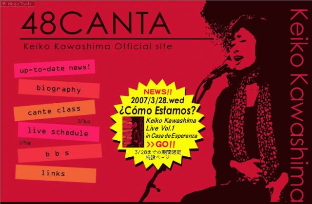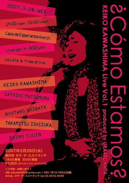 ?COMO ESTAMOS? 〜川島桂子ソロライブ〜 ついにお蔵出し・・・!? 人気実力共に強力若手アーチストをしたがえた自主企画ライブです。 川島桂子、今宵思う存分好きに唄わせていただきます!! 2007年3月28日(水) 開場/19:00〜 開演/20:00〜 会場/高円寺 カサ・デ・エスペランサ http://www.esperanza-j.com/ チャージ/4,800円(タパス+フリードリンク付) <出演> 川島桂子 松村哲志、柴田亮太郎、石塚隆充、伊集院史朗 <問い合せ先> カサ・デ・エスペランサ tel.03-3316-9493 ※48CANTA チケット受付 48c-ml-ticket