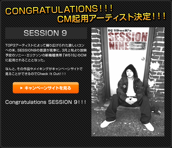 周知の事実、我等がSESSION9の5DUCKの楽曲が流れてるauのCMはCHECKした? まだの人は要CHECK!! BIG RESPECT 4YO VOTE!! そしてこの度、SONYのSDグループ(新人開発セクション)主催のEVENT、PLATINUM GATEにSESSION9がPICK UPされ、出演が決定!! そこで、是非一緒にLIVEを盛り上げて貰いたい、勿論皆をぶち上げる様なSHOWは必ず約束するからさ。是非是非ふるって遊びに来てくれよな!! [PLATINUM GATE] 2007.3.28 WED @渋谷VUENOS TOKYO OPEN: 17:30 START: 18:00 ¥1,000/1d -ゲストが必要な人は連絡してね。