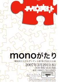 横浜国立大学モダンダンス部 第17回自主公演「monoがたり」 はじめまして、横浜国立大学モダンダンス部のいとうまきと申します。 このたび横浜国立大学モダンダンス部は、第17回公演「monoがたり」を行うこととなりました。 唯一無二の、他の何とも異なる各々の個性が生きている公演を、作品をという想いから「monoがたり」という題を付けました。決して人数は多くない部活ですので、自ずと個性は光っている光らせている、そんな部活の自主公演です。 是非是非、ご家族・ご友人・彼氏彼女・親戚・知り合い・知り合っていない人まで沢山のお誘い