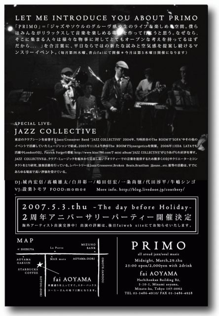 「PRIMO」=「ジャズやソウルのグルーヴ感や生のライブを楽しめる空間。僕らはみんながリラックスして音楽を楽しめる場所を作って行こうと思う。なぜなら,そこに集まる人々は様々な物事に対してとてもオープンな考えを持ってるはずだから... 」を合言葉に、平日ならではの新たな試みと空気感を提案し続けるマンスリーイベント。(毎月第四木曜、青山faiにて開催*今月は第5木曜日開催になります)