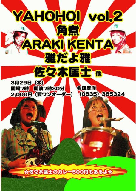3月29日(木) 『YAHOHOI!!vol.2』 印度洋(山口) OP19:00 ST19:30 ¥+(1drink order) ・角煮(札幌) ・ARAKI KENTA(広島) ・佐々木匡士(山口) etc... ※佐々木匡士 のカレー(500円)がでます。