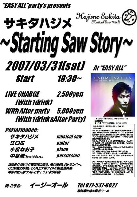 3月31日(土) イージーオール(滋賀 大津) サキタハヂメ 〜Starting Saw Story 全国Tour 第一弾〜 京滋のクラシック音楽家の集う、隠れ家的レストランバー。 CD録音に参加してくれた大阪フィルの打楽器奏者・中谷満さんがゲストです! 出演:サキタハヂメ musical saw/江口広 gt/ 小松なお子 p ゲスト:中谷満 per スタート18:30 /チャージ \2500 / 1drink付 問・ご予約:イージーオール tel 077-537-6627 滋賀県大津市螢谷3−4 http://www.musicalsaw.net/