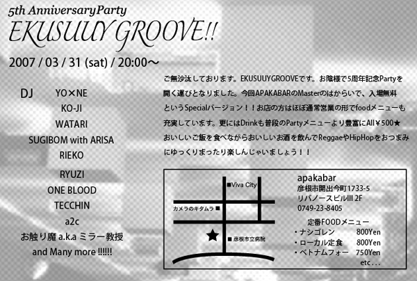 みんなでワイワイしましょう!!! 5周年を迎えたEKUSUUY GROOVEと一緒に遊びましょう なんと入場無料で〜〜す。。。 場所:APAKABAR(彦根) 入場料:無料 時間:20時〜 音:HIPHOP/REGGAE/HOUSE Dj: KOJI WATARI SUGIBOM with ARISA RIEKO YO×NE (EKUSUUYGROOVE!!) RYUZI ONE BLOOD a2c TECCHIN おさわり