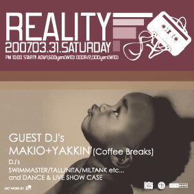 ●主催者Swimmasterの意向を完全に無視して勝手に告知ぶっこきます。管理人様よろしくです。ww ●Start22:00〜Sunday Morning!! ●ADV.1500Yen(1D) Door.2000Yen(1D) ●Guest DJ's ☆DJ Makio & Yakkin'(Coffee Breaks!!) ●DJ's ☆Swimmaster ☆Tall ☆Nita ☆Miltank ...etc...and Dance & Live Show case!! ●What's About Coffee Breaks!! Coffee Breaks!!、始まりの合図はおよそ4年前のClub Move。彼らの選曲に感じる超Hiphop的感覚は、膨大な量のレコードを聴き込み解釈した音楽知識だけでつむぎ出されたもので