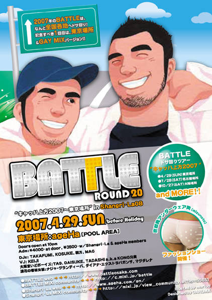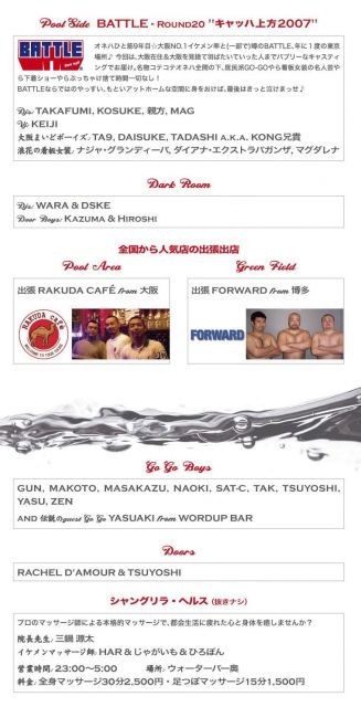 毎度まいど〜☆オネハひと筋9年目、大阪発・全世代型ゲイナイトBATTLEの2007年は、ななな〜んと!誕生以来初となる全国ツアーを開催!名づけて、BATTLEドサ回りツアー"キャッハ上方2007"!!