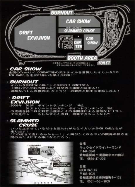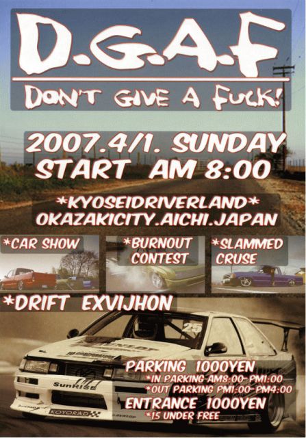 2007,4/1(SUN)AM8:00〜PM4:00 愛知県岡崎市のキョウセイドライバーランドにて GOOD HABITS主催 D.G.A.F/DON'T GIVE A FUCK! が行われます! ★内容 CarShow BurnoutContest DriftExvijhon SlammedCruse ★エントリー対象 トラック、コンパクト、USDM、他 *写真選考あり ★エントリーフィー カーショー 10,000円/1台 バーンナウトコンテスト 3,000円/1台 ショップブース 30,000円/1ブース ★アワード16本!!トロフィもこった物を用