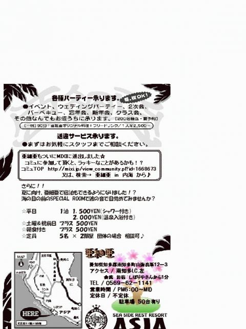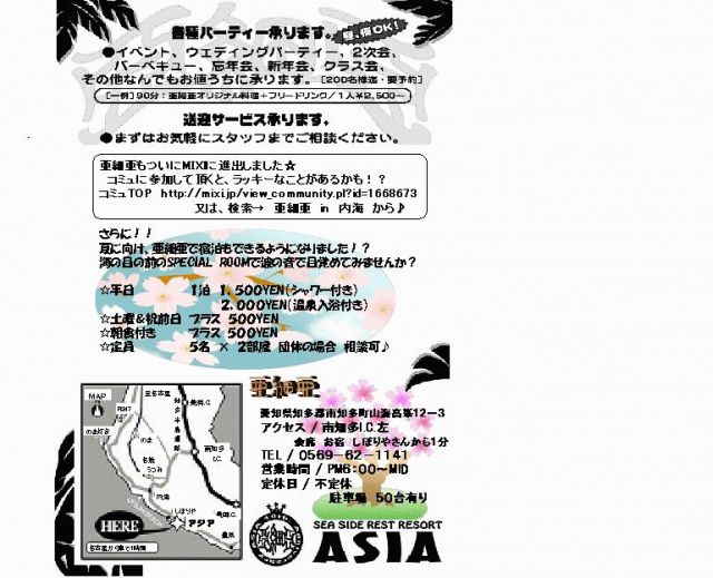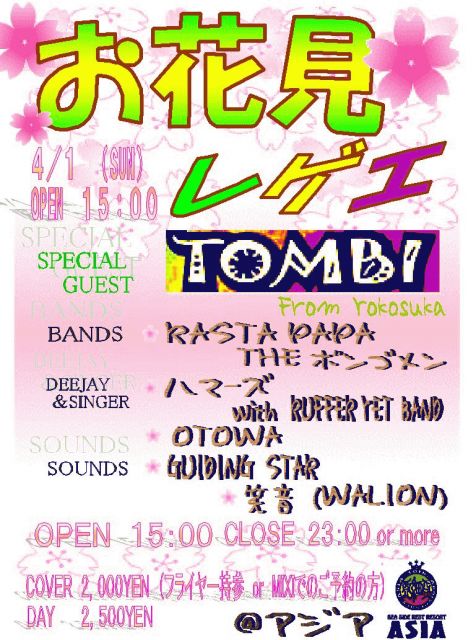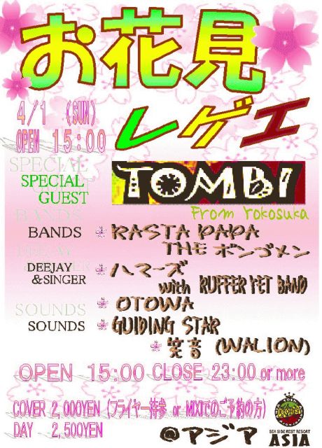 夏の始まり春がやってきました♪ 今年は桜咲くのもきっと早いですよね! せっかくこんなお天気がいいので亜細亜で 春の始まりをお祝いしましょぉ☆ めったに見れないあの超豪華アーティスト出演予定です♪ 日時; 4月1日(SUN) OPEN 15時 CLOSE 23時 お泊りもご用意できます♪ 詳しくはトピックを♪ 要予約!先着です! SPECIAL GUEST; TOMBI FROM 横須賀 TOMBI HPにも載ってます! http://www.jimcy.com/tombi/topics/topics.cgi LIVE ; RASTA PAPA TH