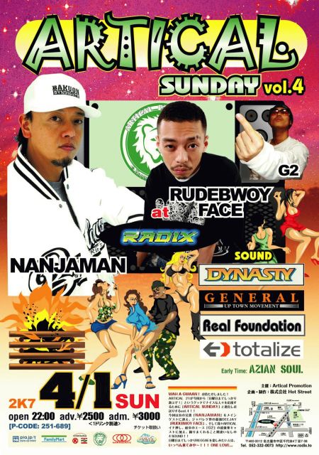 ARTICAL PRO,のお贈りするDANCE♪ -『ARTICAL SUNDAY』vol.4- ■RADIX ■2k7 4.1(Sun)22:00〜 ■adv.2500yen adm.3000yen (当日「HAPPY CARD」を提示された方は前売りで入場可) ■DEEJAY ・NANJAMAN ・RUDEBWOY FACE ・G2 ■SOUND ・DYNASTY ・GENERAL ・Real Foundation ・totalize Early time:ASIAN SOUL ARTICAL21から『ARTICAL SUNDAY』へと進化。日曜日までしっかり遊ぶぞ!!!っていうグッドでナイスな人達を応援するためにエイプリルフールから再スタートするARTICAL DANCE!! 10数年リアルを語り続けて