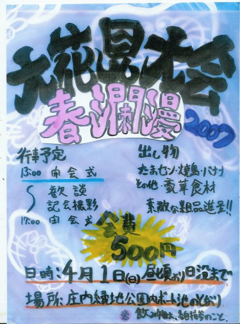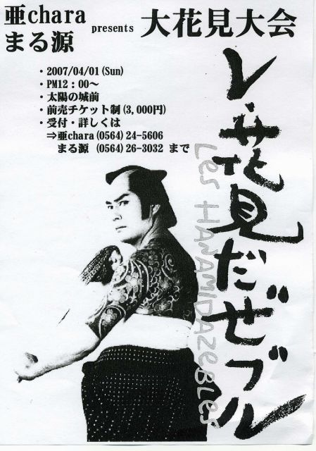 亜チャラ+まる源presents大花見大会 『レ・花見だぜブル』 ・2007/04/01(sun) ・PM12:00〜 ・太陽の城前 ・前売チケット制(3,000円) *受付、詳しくは・・・ 亜cha:la(0564)24-5606 まる源 (0564)26-3032 まで!! え〜亜チャラ&まる源主催のお花見です★ 太陽の城まえの河原であります! 屋台とかでてないほうの河原ですよ〜〜〜◎ 『完全前売チケット制』となっておりますので どうぞお早めに、亜チャラorまる源にてチケットお買い求め下さいませ♪ みなさま! 桜の木の