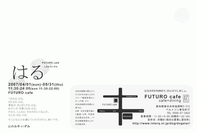 futuroにもはるがきました 「にのみやいずみ」さんの展示期間中に何度か作品が変わっていく予定です 期間中にぜひ足をお運びください 営業時間 OPEN 11:30 CLOSE 24:00 (定休日前日はCLOSE 22:00) 定休日:毎週月曜日(祝日の場合は火曜日休み) ●お店詳細 愛知県 (春日井市柏原町5-312ベルメゾンカスガイ1F FUTURO cafe+dining) http://www.interq.or.jp/dog/dogstar/ 電話:0568-57-2422 車でお越しの方 国道19号 「市役所北」交差点を北西へ曲がる (名古屋方面から多治見に向けての方は左折)