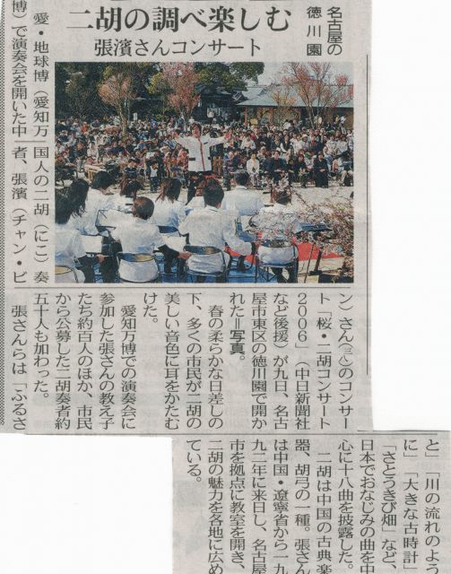 昨年から始まったこのイベントは、日本のお花「桜」と中国の楽器「二胡」をコラボして、日中友好そして、音楽とお花見を一緒に楽しもうという、ボランティアコンサート。 入場無料です。 二胡はプロ奏者も、市民のみなさんも演奏します。 昨年は大賑わいでした。みなさん聴きにきてくださいね。 今年は、日中国交正常化35周年。来年は北京オリンピック、2010年は上海万博と、これから中国がますます熱いです♪ 詳しくはこちらへ。。 http://www2.odn.ne.jp/zhangbin/ コミュは。 http://mixi.jp/view_community.pl?id=809514 写真は昨