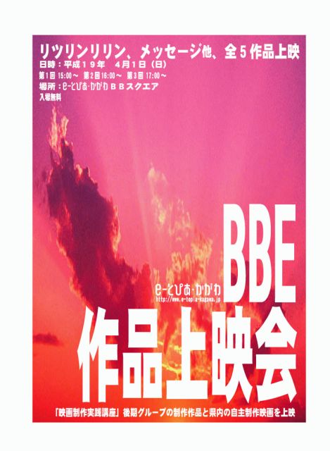 「映画制作実践講座」後期グループの制作作品と 県内の自主制作映画を上映。 日時:2007年 4月1日(日) 第1回 15:00〜 第2回 16:00〜 第3回 17:00〜 場所:高松シンボルタワー タワー棟4・5階 e-とぴあ・かがわ BBスクエア 入場無料!!!
