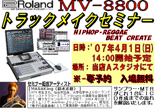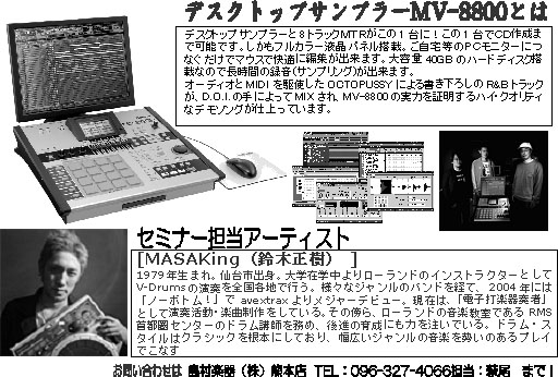 デスクトップサンプラーMV8800を使ってMASAKing氏がHIPHOP、レゲエ系のトラックメイクセミナーを行います。 MV8800はサンプラーと8トラックMTRが一つになった画期的な機材です。40GBハードディスク、CDRWドライブも搭載で、サンプル音源も存分に詰め込め、最終的に出来た曲を簡単にCDに焼くことが出来ます。 そして、標準のモニターもカラー液晶にパワーアップ!さらにご自宅のPCのモニターにつなぐと付属のマウスを使ってほぼPC感覚で曲作りが出来ます。 入場:無料(要予約) 参加の方は必ず事前にご連絡ください。