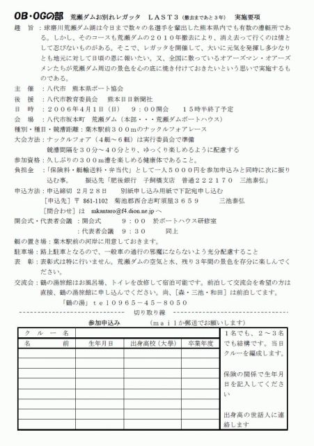 熊本県内有数の水域であり、幾多の熱戦を繰り広げた荒瀬ダム。 その荒瀬ダムは2010年に撤去されます。 そこで「何もせずに消え去っていくのは忍びない! レガッタを開催して多少なりとも荒瀬ダムの景色を心に 焼き付けておこう!」 というのが、このレガッタの実施目的です。 詳細は画像を見てみてください。 都合の付く人は友達を誘って是非参加してみてください★ (注)参加料5千円と書かれてますが、 安くするかもしれない(和田先生談)とのことなので、 要確認です。 熊本県ボート協会 http://www1.bbiq.jp/kara/