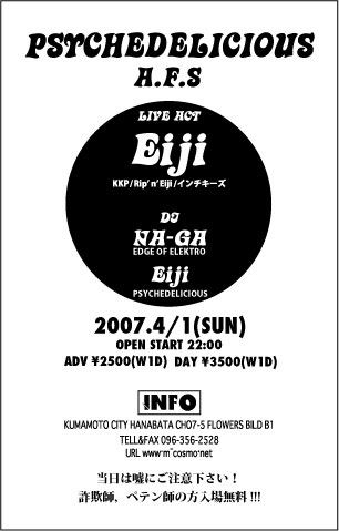 嘘800万馬力!!! GUESTに熊本ではおなじみ!Eijiさんを招いてのPARTY!! Eiji 自分の音を求めて旅を続ける音楽バカ。 ギタリスト、作曲家、トラックメーカーとしてCM,VPなど映像への楽曲提供や他のアーティストのレコーディング及びライブのバックアップ等の仕事に長年たずさわる。 Tsuyoshiがゴールドで行ったパーティーを切っ掛けにトランスシーンにはまり込み自分でもパーティー向けトラックを作りはじめる。その後 Interchill,Psy-Harmonics等国内外のレーベルより楽曲をリリース,またオーストラリア及びブラジルでの演奏も経験している。