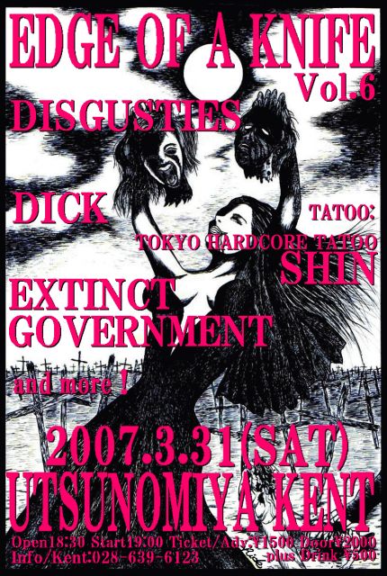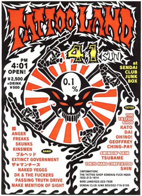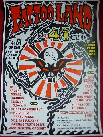 「TATTOO LAND」 仙台 CLUB JUNK BOX 4月1日 日曜日 午後4時1分オープン!! ///「BAND」/// EXTINCT GOVERNMENT/ANGER/FREAKS/SKUNKS/KINSMEN/鎧/ブルヘット/ザ★マンチーズ/NAKED YEGGS/DK&THE FUCKERS/PASSING TRUTH DRIVE/MAKE MENTION OF SIGHT/and more... ///「TATTOO」/// THE TATTOO SHOP KATO/DAI/OH!NO!/GEOFFREY/CHING-PAY SWING`SKIN TSUBAME TOKYO HARDCORE TATTOO SHIN OPEN16:01 TICKET/DOOR¥2500+DRINK\500- 場所は LIVEHOUSE SEN