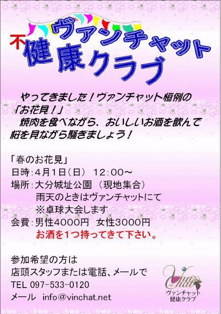 「春のお花見」 12時スタート 男性4,000円 女性3,000円 お酒を一つもってきてください 参加希望の方は 店頭スタッフまたは電話、メールで TEL 097-533-0120 メール info@vinchat.net