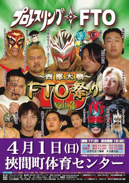 【FTO祭りvol.3〜西部大戦〜】 4月1日(日) 挾間町体育センター 大分県由布市挾間町向原172 (097)583−2881(駐車場有り) 開場17:30〜 試合開始18:30〜 〈チケット〉一般前売り3000−中高生前売り2000−(当日500−増し、小学生以下無料) 〈お問い合わせ〉FTOプランニング (097)546−9987 http://oita-fto.com 《対戦カード》 [メインイベント] スペシャル6メンタッグマッチ 時間無制限1本勝負 スカルリーパーA−ji、吹本賢児、VINNI 対 x