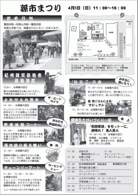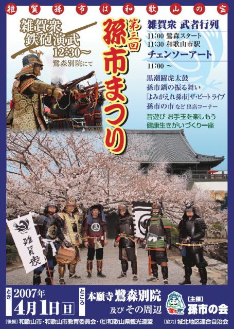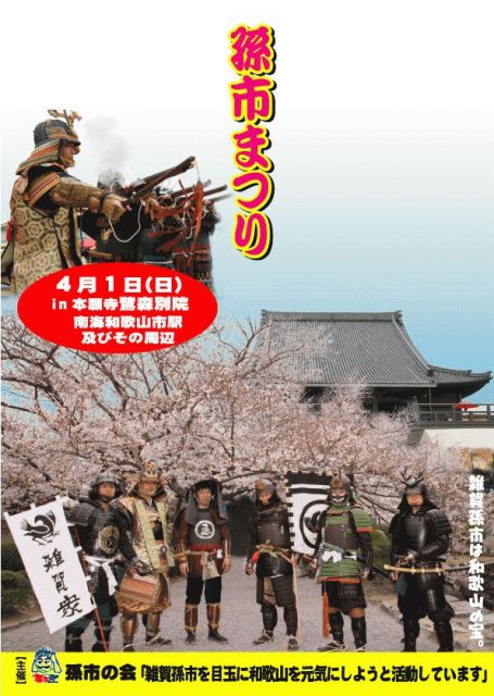 孫市まつりは、今年で3年目の『孫市の会』主催の手作りの祭りです。「雑賀孫市は和歌山の宝」を合言葉にかつて雑賀衆が活躍した 本拠の場所、鷺森別院周辺で4月1日(日)に開催いたします。 主催:孫市の会 後援:和歌山市・和歌山市教育委員会・和歌山県観光連盟 協力:城北地区連合自治会 【参加甲冑武者のみなさまへ】 ○簡単なスケジュール 集合:9時30分(ビジネスイン南海) 10:30 着替え完了 10:40〜10:50 説明 11:00 鷺森別院甲冑隊行列出発! 境内まつり開始!チェーンソーアート
