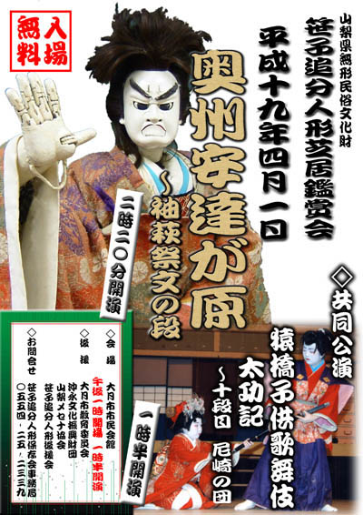 昨年に続いての本格公演です。 演目:奥州安達が原-袖萩祭文の段- 会場:大月市市民会館 開場:午後1時 開演:午後1時30分 共同公演:白猿座子ども歌舞伎 入場無料です。 大月に残る、県無形民俗文化財指定の人形遣いを是非一度ご覧下さい。