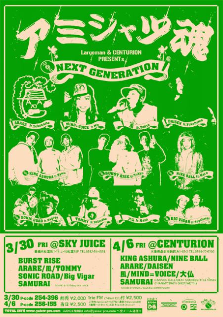 アミシャツ魂3rdは今現場を盛り上げてる若手でッ! ★DJS'★ ☆ARARE ☆DAISEN ☆風 ☆MIND-VOICE ☆大仏 ★SOUNDS★ ☆KING ASHURA ☆NINE BALL ☆SAMURAI SUPER POWER ★Warm Up SOUNDS★ ☆FRUIT PUNCH ☆ICE CLIMER ★DANCERS★ ☆BACK SHOT ☆CHUPS ☆HIGHER ★SOUND SYSTEM★ ☆SAMURAI SUPER POWER FULL POWER=3 前売りー2000円 前売りCD付きー2500円(CDは最近、ジャマイカの最新のIrie FMの物になると思われます) 11:00pm〜START チケットぴあ P-code →256155 FamilyMart・Circle K・Sunkusで