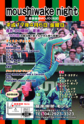 いよいよ暖かくなってきましたねー。 桜が咲き始め、春爛漫です♪ さて、新しいことをやるにはピッタリの季節 なんで、イベントやらせていただきます! ”moushiwake night” 時間 20:00から夜通し 値段 1000円(1ドリンク+えびせん食べ放題) 場所 音楽喫茶モジョ http://www.mojo-m.com/company/place/address.html DJ: ダンボール manakeche ところ(Roots Music Caravan) シン 土下座 たしなみ (mojo) ataguchi AWA and more… GUEST DJ: daw(Roots