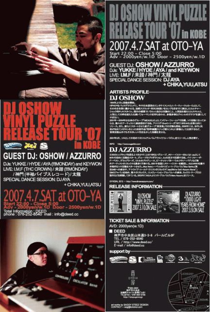 先日、DJ OSHOWがRELEASEしたばかりのALBUM、"VINYL PUZZLE"を引っさげてのツアーイベント。今回の神戸のイベントではスペシャルゲストとしてDJ AZZURROが登場。かなりいいイベントになりそうですので、是非遊びに来てください!!