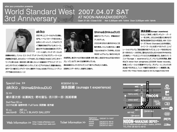 今回で3周年を迎えるWORLD STANDARD WESTにakikoが出演します。全曲ブラジルレコーディングの最新作「Vida」を引っさげて昨秋以来となる大阪でのライブ。皆さん是非遊びに来てください。