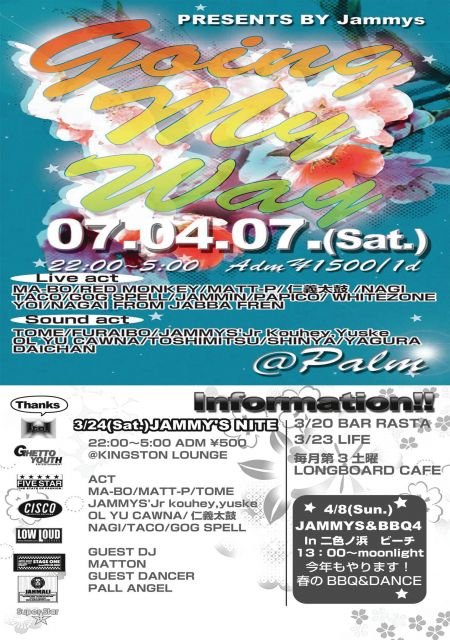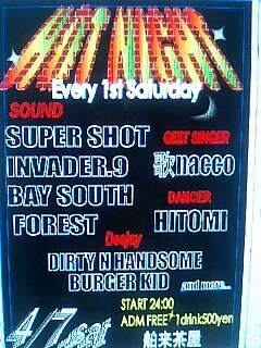この場をお借りしまして 告知させて頂きます。 4/7.SUT 関内:舶来茶屋(JR関内駅より徒歩3分) START24:00〜 ADM☆FREE!!!(入場料タダ) 1Drink/\500 SOUND SUPER SHOT INVADER.9 BAY SOUTH FOREST DANCER HITOMI GUEST SINGER 歌nacco DEEJAY DIRTY N HANDSOME and more… RUB-A-DUB☆OPEN MIC!!! いつもはRESTARANT BARの『舶来茶屋』ですが 毎月第1土曜はREGGAEイベント“HOT NIGHT” 横浜を拠点として活動しているREGGAE SOUND 土曜の夜はここで盛り上がること間違いなし!!!