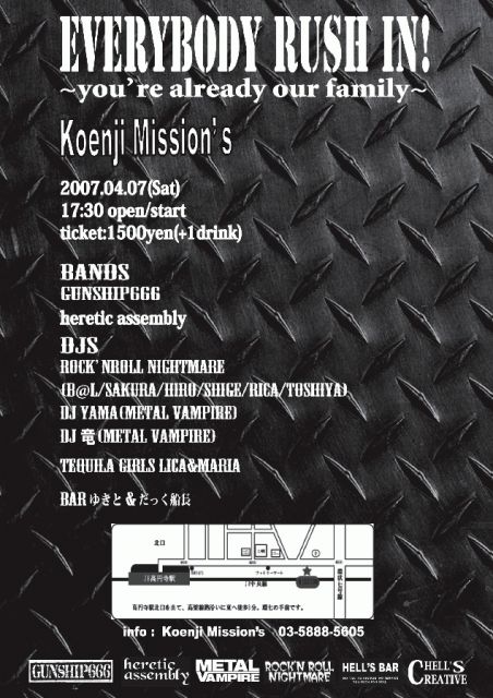 Everybody Rush In! 〜you’re already our family〜 2007.04.07(Sat) 高円寺Mission’s 17:30 open/start ticket:adv/door 1500yen/1800yen (+ 1 order) BANDs ・GUNSHIP666 ・heretic assembly DJs ・ROCKN’ROLL NIGHTMARE crew ・DJ YAMA(METAL VAMPIRE) ・DJ 竜(METAL VAMPIRE) info 高円寺Mission’s: 03-5888-5605 告知失礼します!いつも色んな所でお世話になっておりますheretic assemblyが高円寺に新しく出来るライブハウス&バー、高円寺Mission'sのオープン記念も兼ねたイベントに出演していただ