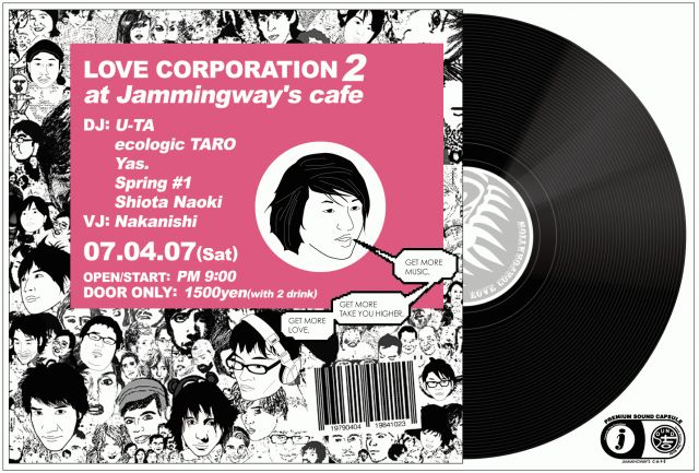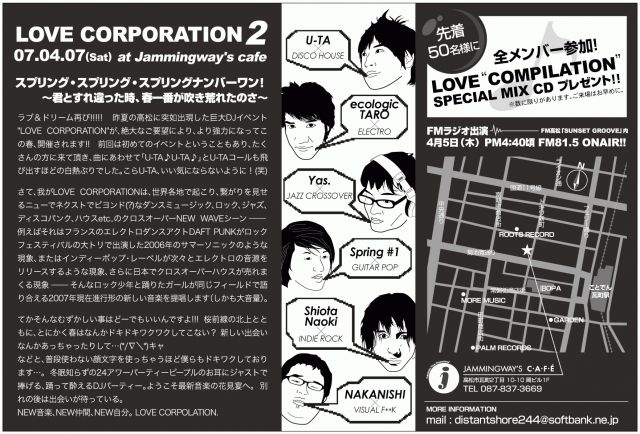 ラブ&ドリーム再び……。 昨夏の高松に突如出現した巨大DJイベント "LOVE CORPORATION"が、絶大なご要望により、 より強力になってこの春、開催されます!! そして先着50名様にはSPECIAL MIXCDプレゼント★ 4月5日にはFM高松ラジオ出演!! PM4:40分頃ONAIR!!!!!!!!!!!!!!!! これをチェックして7日はジャミングへ行くべし!!! ■Love Corporation 2 @Jammingway's Cafe 2007年4月7日(土) 当日のみ 1,500円(2drink付) OPEN 21:00 DJ:U-TA,Ecologic TARO,Yas.,Spring#1,シオタナオキ VJ:Nakanishi
