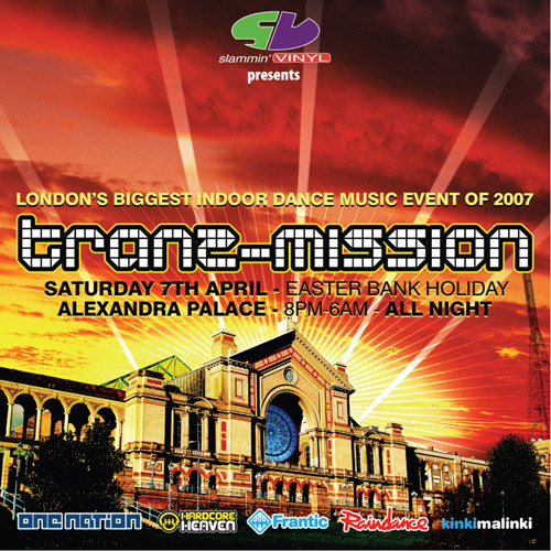 詳細→ http://www.slamminvinyl.com/eflyers/tranz2007/indexlauncher.htm TRANZMISSION 2007:SlamminVinyl, Frantic, One Nation, Hardcore Heaven, Raindance, Kinky Malinki合同イベント。各音楽界の大御所プロモーションの合同イベント。 今回で3度目。 毎年チケット完全完売。 5アリーナ。 1万人規模。 ロンドン最大の屋内クラブイベント。 DJ70人+。 今年は音響/照明システムに£100,000,00+掛けて挑む。 ALEXANDRA PALACE:ロンドン北部。最寄地下鉄駅で言うとMUSWELL HILLと WOOD GREENの間。196エーカー(約7