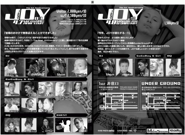 「子供の頃、大好きなキャラクターや宝物で埋め尽くし、見るだけで笑顔にさせてくれたオモチャ箱・・・。 そんなオモチャ箱のようなすてきな空間をご用意致しました。 憧れていた正義のヒーローのようなGoGo−Boy、人形のように綺麗に着飾ったドラッグクィーンに魅了されてください。 打ち上げ花火のようなサプライズイベントも盛りだくさん! ドレスコードは白。お酒や音に身をゆだね、遊んでみてはいかがですか? 総勢16名の出演者がどのように飛び出すのかは、『JOY』というオモチャ箱のフタを開けてのお楽しみ!」 と1回目を